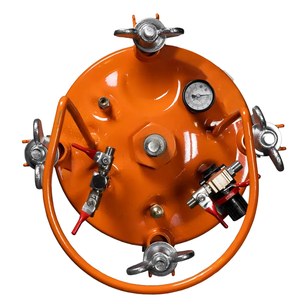 - Крышка оборудована разъёмами для подключения окрасочного пистолета и шланга подачи давления. На ней также расположен манометр, редуктор и предохранительный клапан, предотвращающий выход оборудования из строя по вине превышения уровня давления.