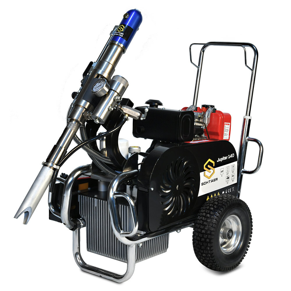 Schtaer Jupiter 14D – это безвоздушный дизельный окрасочный аппарат, предназначенный для распыления красок с высокой степенью вязкости. Его также используют при работе с огнезащитными составами, гидроизоляционными материалами, антикоррозионными красками, шпатлевками, цинконаполненными материалами, эмалями, мастиками, грунтовками и другими лакокрасочными материалами, предназначенными для нанесения через поршневой безвоздушный окрасочный аппарат. Сферы применения этой модели разнообразны. Ее используют для покраски стен, фасадов и потолков, металлических конструкций, бассейнов, крыш и куполов. Она может применяться при работе с балками, заборами, мостами и тоннелями, изготовленными из металла. Профессиональный аппарат подходит для нанесения дорожной разметки, но при этом потребуется дополнительное оборудование. Модель обладает высокой производительностью (14 л/мин), работает под давлением 230 Бар при мощности 4 000 Вт.