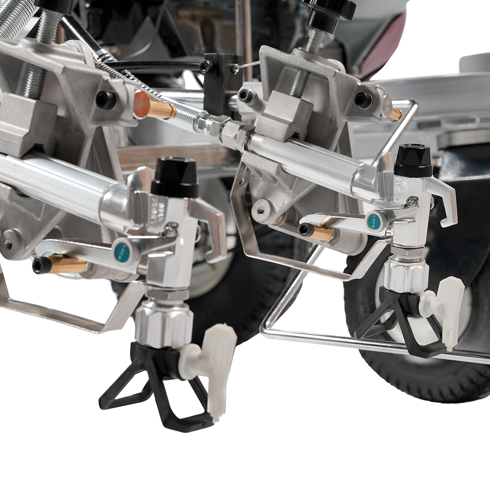 • краскопульт на разметочной машине установлен на кронштейне, отсоединив его можно распылять краску безвоздушным пистолетом вручную в радиусе длины шланга;