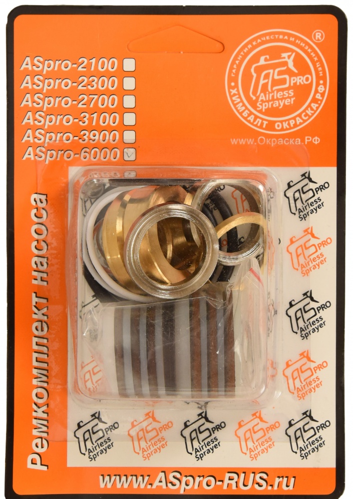 Ремонтный комплект для окрасочного аппарата ASpro-6000 состоит из набора поршневых уплотнительных колец, уплотнительных колец для штока поршня, фиксирующих шайб уплотнений поршня, шаров клапанов (входного и нагнетательного), герметизирующих резиновых и полиуретановых колец. Материал поршневых колец - полиуретан и кожа. Набор содержит все необходимое для обслуживания насоса.
