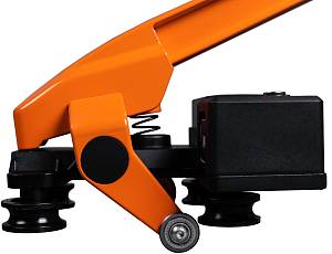 Каретка огибает направляющую с двух сторон, что предотвращает "перекашивание" при сильном давлении. Режущие ролики из карбида вольфрама с титановым покрытием имеют диаметр 22 мм. Они обеспечивают чистый и ровный разрез плитки.