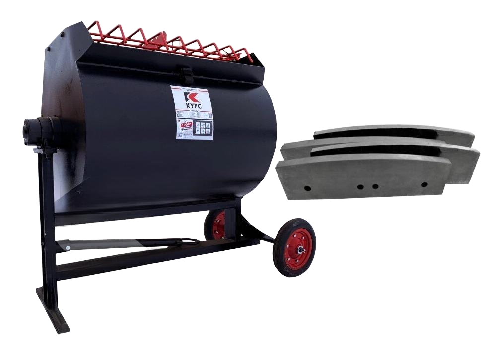 Внутри барабана растворосмесителя размещены лопасти, зазор между ними и корпусом барабана составляет 5-17 мм. Лопасти обрезинены специальными накладками – сменными резиновыми лопатками. Резиновую защиту лопастей по мере истирания можно заменять (в комплекте с растворосмесителем идут 4 резиновые лопатки для замены). С помощью ручки, размещенной на корпусе барабана с внешней стороны, его можно опрокидывать, выгружая таким образом приготовленный раствор в цементную тару.